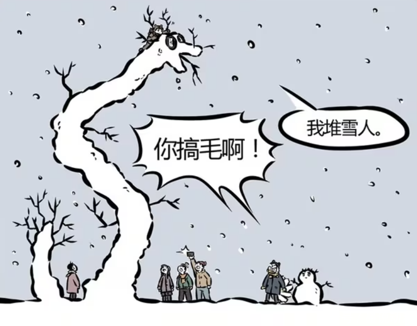 《非人哉》漫画版中,精卫填海的毛病从来没有好过。这一次哮天被迫营业,成为雪橇犬,拉着精卫和石子在冰天雪地里填海。哪吒和九月就正常多了,一起堆雪人。不过哪吒的雪人可不简单,竟然能堆出龙的模样。
