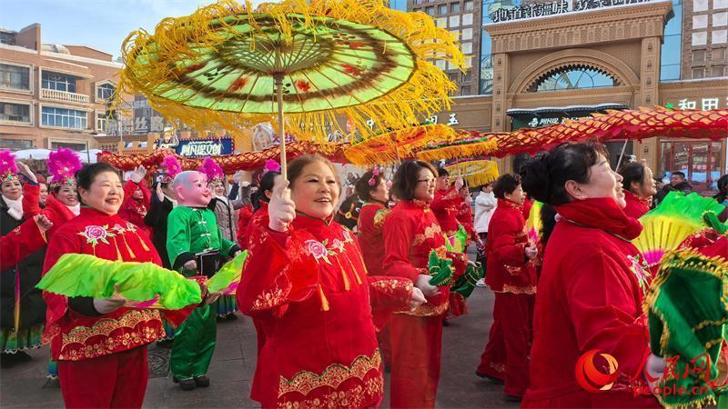“这么多人一起闹社火,我整个人都年轻了。”来自乌鲁木齐市水磨沟区社火队的王爱美今年79岁,她秧歌扭得非常起劲,“现场有很多游客看我们表演,我是越扭越开心。”