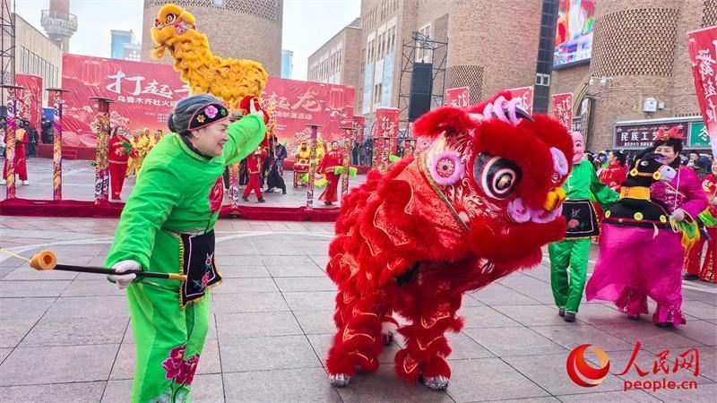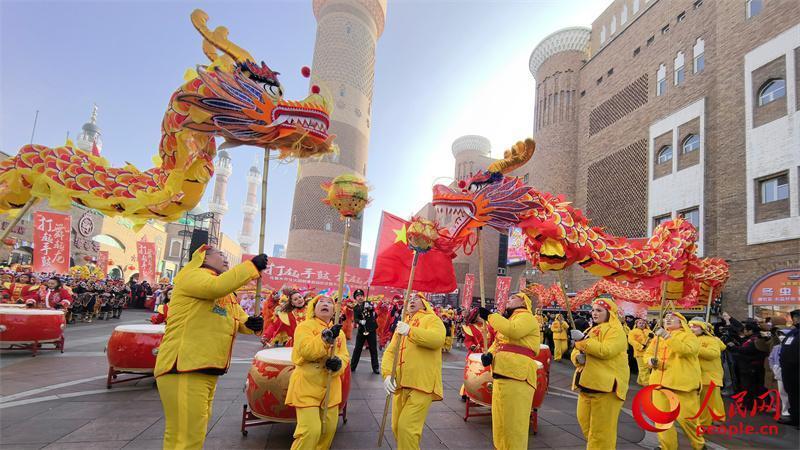 1月22日,“打起手鼓 舞起龙”乌鲁木齐社火迎新春活动在新疆国际大巴扎上演。人民网记者 陈新辉摄